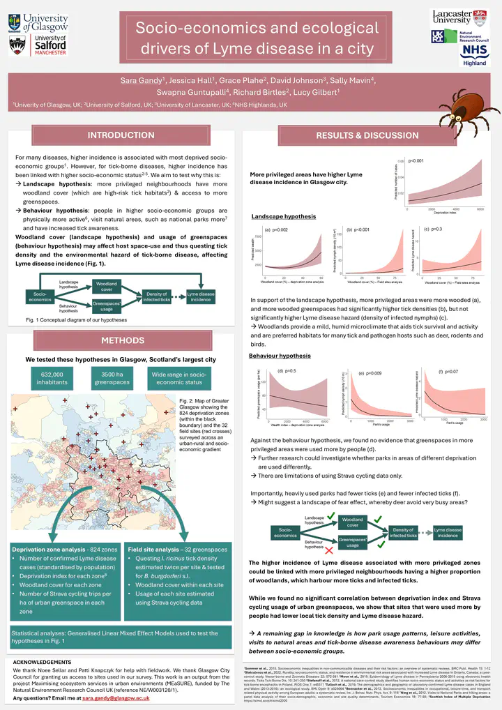 In response to the growing need for ecosystem services, many cities have adopted nature-based solutions such as tree planting and green corridors to increase biodiversity and improve climate change resilience. However, these efforts may inadvertently increase tick-borne disease risk by attracting wildlife tick hosts. Our study focuses on the city of Glasgow in Scotland and examines both ecological and socioeconomic drivers of deer abundance, tick density, Lyme disease hazard and Lyme disease incidence across the city and its surrounding rural areas. We found that less deprived areas exhibit higher rates of Lyme disease incidence and tend to have greater woodland cover, suggesting that people in these areas may live closer to habitats favourable for both tick and pathogen hosts. To explore ecological processes further, we surveyed 32 greenspaces and woodlands along an urban-rural and deprivation gradient. Using structural equation modelling, we found that tick density and Lyme disease hazard are significantly influenced by woodland cover, built-up cover and deprivation index within a 1000 m radius of surveyed sites. These findings underscore a key challenge for urban planning: while rewilding and greenspace expansion support biodiversity and climate resilience, they may also elevate tick-borne disease risks. Additionally, the influence of socioeconomic factors on Lyme disease incidence calls for deeper research into how behaviour, exposure and access to healthcare may shape risk. Future urban design must carefully balance ecological benefits with public health considerations to minimize unintended consequences of rewilding efforts.