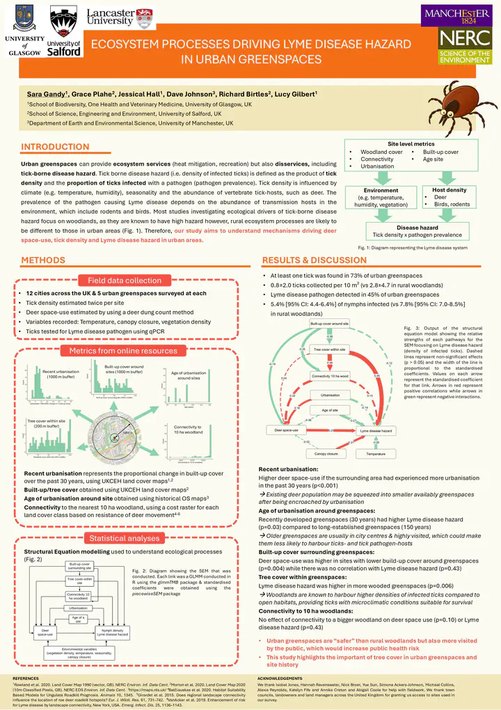 Urban greenspaces can provide ecosystem services (heat mitigation, recreation) but also disservices, including tick-borne disease hazard. Most studies investigating ecological drivers of tick-borne disease hazard focus on woodlands, as they are known to have high hazard however, rural ecosystem processes are likely to be different to those in urban areas. In this study, we aimed to understand mechanisms driving deer space-use, tick density and Lyme disease hazard in urban areas. We surveyed urban greenspaces and surrounding hinterland sites across 12 towns in England and Scotland and used Structural Equation Modelling to investigate how connectivity, tree cover, built-up cover and recentness of urbanisation affected deer space-use, tick density and Lyme disease hazard.